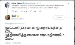 ”சிங்கப்பூரின் உன்னதமான சர்வாதிகாரத்தை விரும்புகிறோம்” – கமல் ட்வீட்