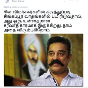 ”சிங்கப்பூரின் உன்னதமான சர்வாதிகாரத்தை விரும்புகிறோம்” – கமல் ட்வீட்